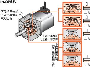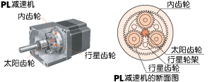 行星齒輪機構的減速機。由太陽齒輪、行星齒輪、內齒輪等3個基本零件所構成。置于中心軸位置的太陽齒輪(一段型減速機時此部份為馬達輸出軸)的外側有多個行星齒輪,利用內齒輪依中心軸圓周做公轉。通過行星齒輪的公轉利用行星輪架轉換成輸出軸的旋轉。 |